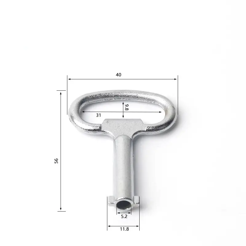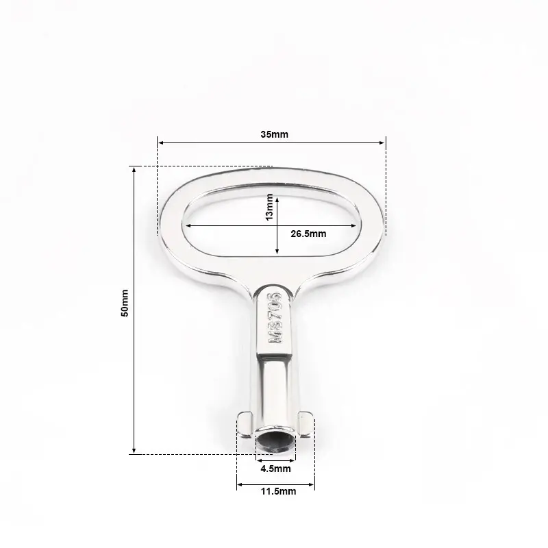 مفتاح الألمنيوم المطلي بالنيكل: أبعاد إجمالية 35 × 50 مم ، قطر مركز قفل الأسطوانة 4.5 مم ، مركز قفل الأسطوانة + قطر الأسنان المزدوج 11.5 مم.