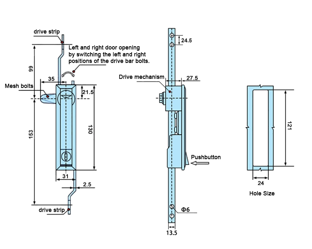 يتكون قفل باب الفولاذ المقاوم للصدأ من الفولاذ المقاوم للصدأ بلون الفولاذ المقاوم للصدأ الأصلي للمتانة ومقاومة التآكل. يبلغ حجم الفتح 24 مم × 121 مم ، مما يضمن التوافق مع تكوينات التثبيت القياسية.