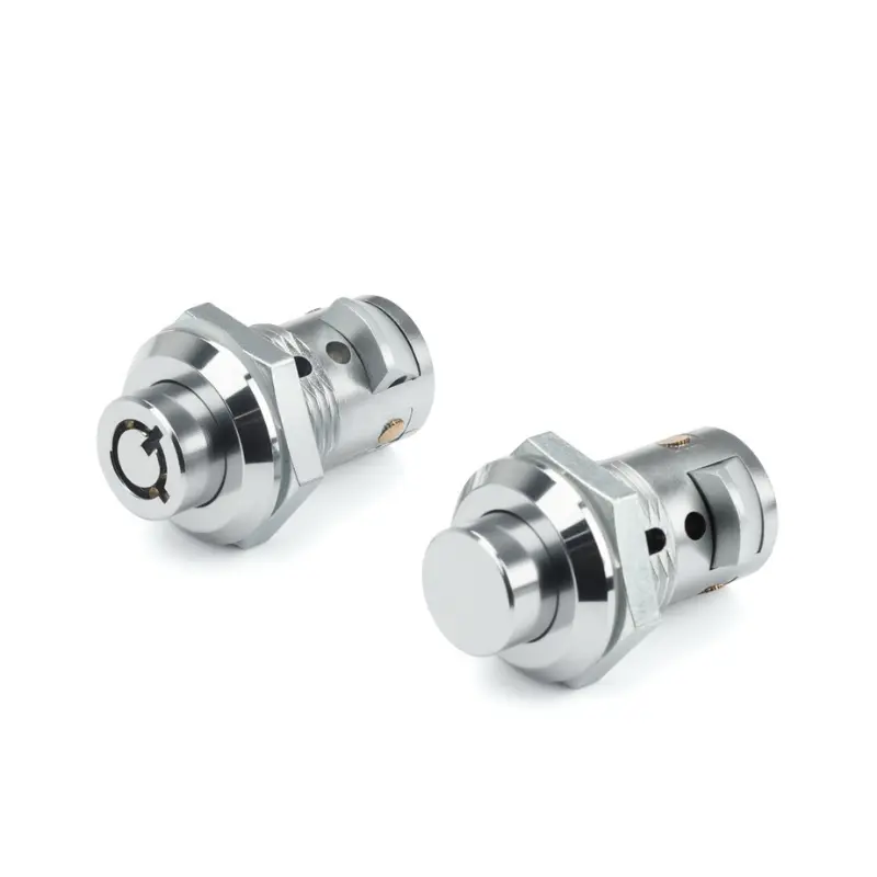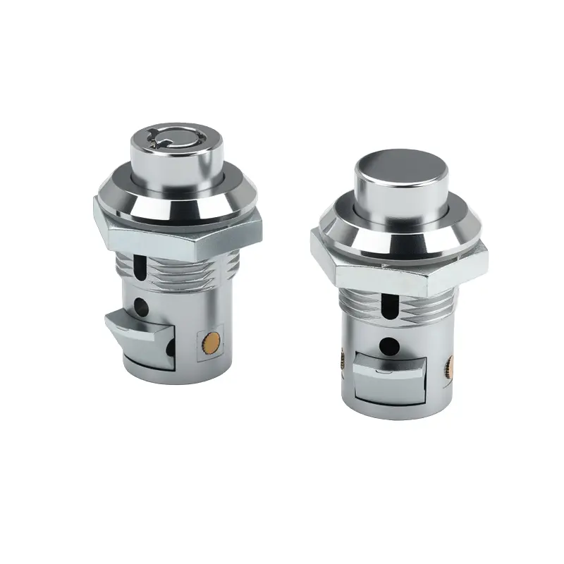 يتم فتح قفل نموذج الضغط على الزر تلقائيًا عند الضغط على الزر ويتم قفله عند إغلاق الباب، مما يوفر حماية أمنية أساسية. يستخدم نموذج القفل ذو الدبوس آلية الدبوس التي تسمح فقط بالتدوير باستخدام مفتاح مطابق، مما يوفر وظيفة مضادة للسرقة. يستخدم كلا الطرازين بنية من سبائك الزنك لتوفير مستوى معين من القوة، وتتميز بحشيات مقاومة للماء إضافية لمزيد من التطبيق العملي. يتميز القفل الأسطواني المصنوع من سبائك الزنك لآلات البيع بلمسة نهائية من الكروم اللامع لمقاومة التآكل. الحد الأقصى لسمك ألواح الأبواب المثبتة هو 10 مم. (بالنسبة لمواد الفولاذ المقاوم للصدأ، يرجى الاتصال بنا. نحن نقوم حاليًا بتصنيع القوالب.)