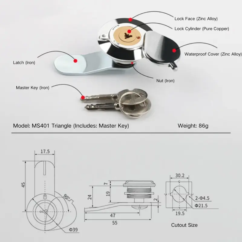 يبلغ قطر وجه القفل 39 ملم، ويدور الغطاء المقاوم للماء بزاوية 90 درجة.